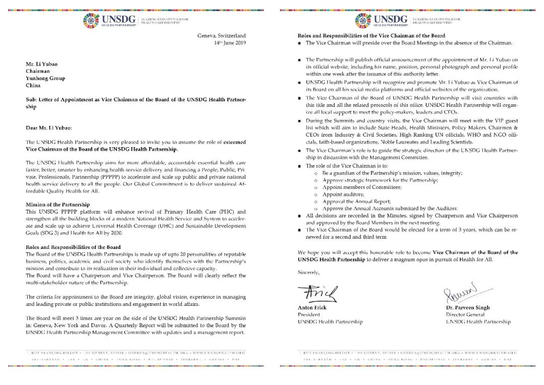 UNSDG健康伙伴关系董事会副主席任职信及译文