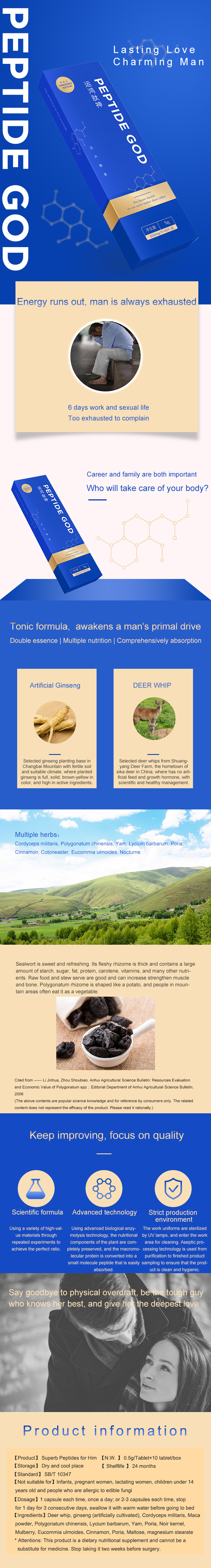 Ingredients: Deer whip, Ginseng (artificial planting), Cordyceps sinensis, Maca powder, Huang- jing, Medlar, Yam, Medlar, Bitter cardamon, Mulberry, Eucommia, Cinnamon, Medlar, Maltose, Magnesium Stearate