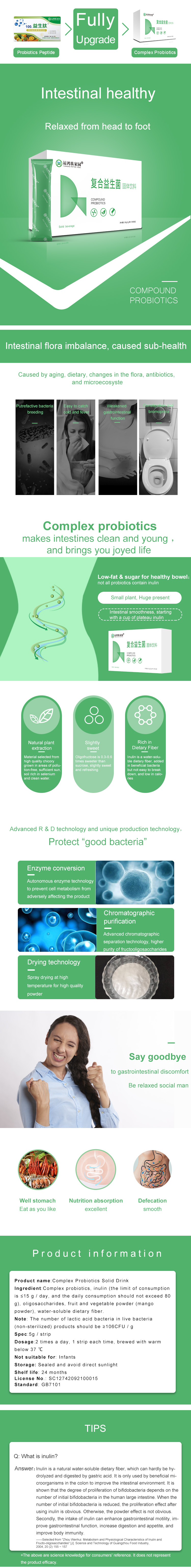 Ingredients: Complex Probiotics Powder, Inulin (Consumption Limit ≤ 15g/Day, Daily consumption should not exceed 80g), Oligosaccharide, Fruit and Vegetable Powder (Mango Powder), Water-Soluble Dietary Fiber
